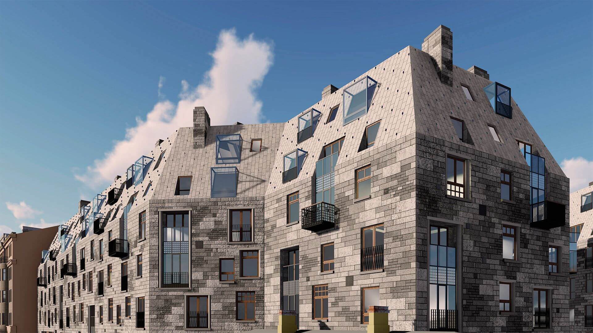 Архитектурный облик жилого комплекса Meltzer Hall выполнен в стиле северный модерн, что придает зданию элегантность и современность. Проект был разработан известным архитектурным бюро «Студия 44», что гарантирует высокое качество и уникальность каждого элемента. Фасады выполнены из натурального камня, а окна имеют разнообразные формы и размеры, что создает динамичный и выразительный облик здания.