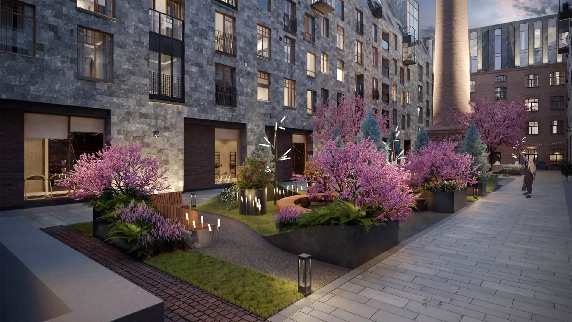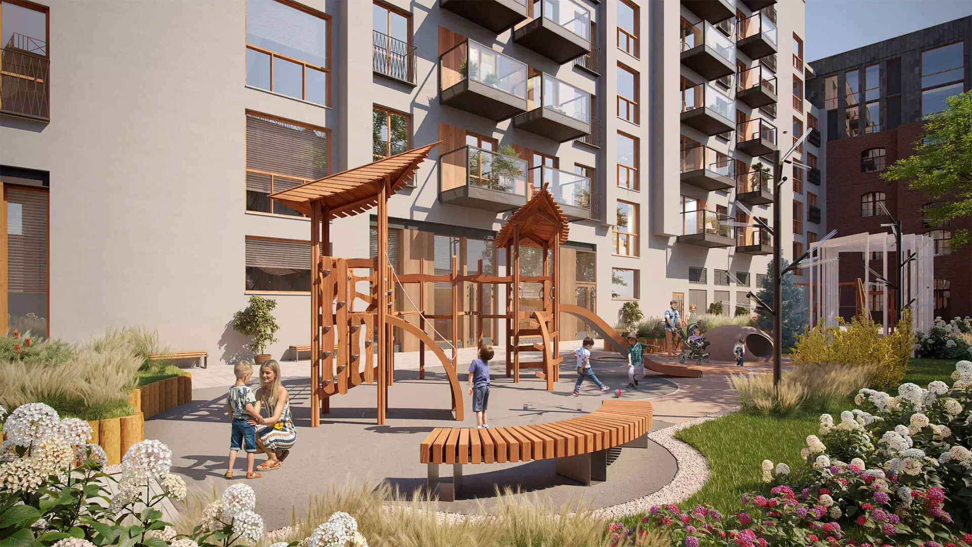 Комплекс предлагает не только эстетическую, но и функциональную ценность благоустройства. Удобные проходы, подсветка дорожек, специальные зоны для велосипедов и колясок, а также лаунж-зоны на террасах создают гармоничное сочетание красоты, практичности и премиального уровня комфорта.