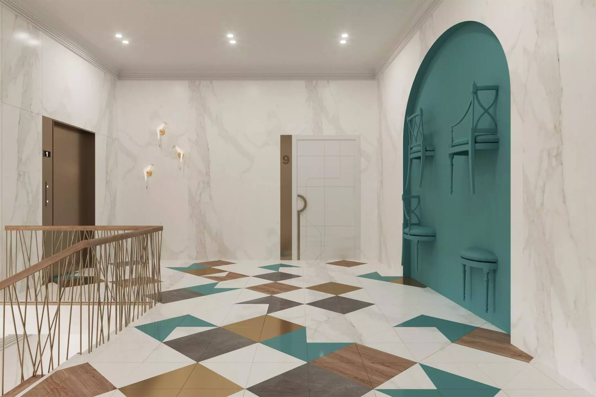 Лобби жилого комплекса Meltzer Hall — это пространство, которое сочетает в себе элегантность и функциональность. Каждое из 12 парадных имеет свой уникальный дизайн, разработанный студией Designic. Вдохновленные предметами мебели братьев Мельцер и шедеврами Фаберже, дизайнеры создали атмосферу роскоши и уюта.