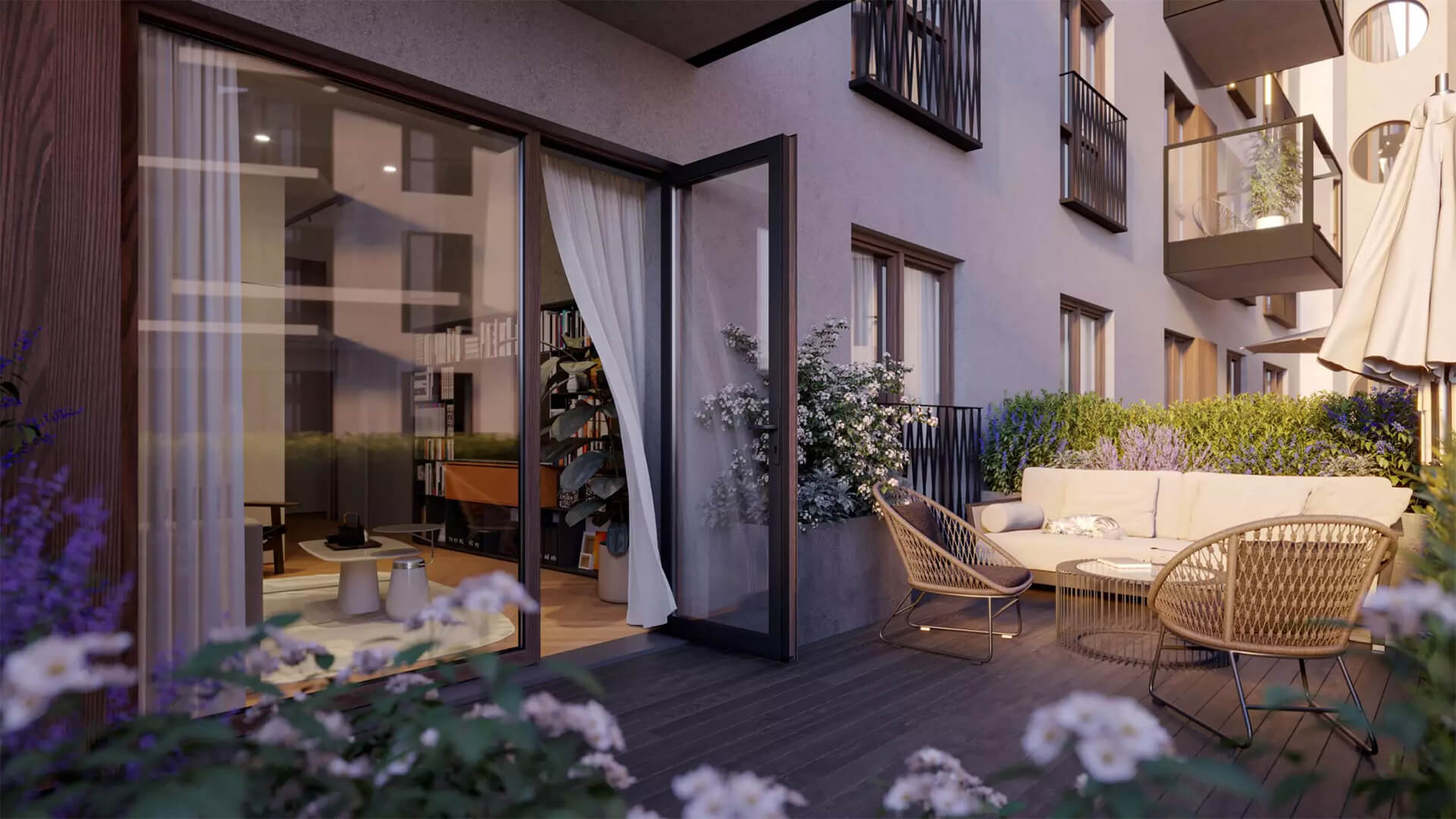 В Meltzer Hall представлены 163 квартиры разных размеров - от 45 до 313 м², два уровня подземного паркинга с зарядками для электромобилей и самокатов, стильные холлы, которые привлекают внимание, и особое место - внутренняя территория, оформленная в современном стиле лаундж-пространства. Концепция благоустройства включает такие элементы, как сад-лабиринт, крытая площадка для выставок и арт-объектов, зона для собраний с мобильной мебелью, гамаками и столиками для пикников, а также детская экоплощадка для разных возрастов с навесом.