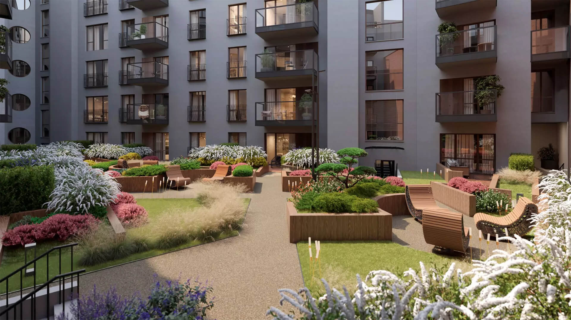 Комплекс предлагает не только эстетическую, но и функциональную ценность благоустройства. Удобные проходы, подсветка дорожек, специальные зоны для велосипедов и колясок, а также лаунж-зоны на террасах создают гармоничное сочетание красоты, практичности и премиального уровня комфорта.